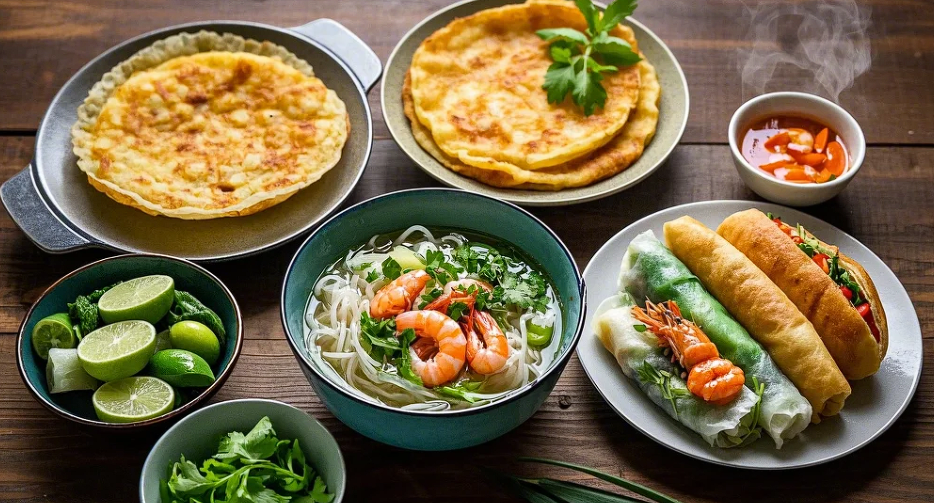 ‘반 쎄오’(Banh Xeo)는 반죽을 얇게 부쳐 부침개처럼 만든 후 새우, 고기, 숙주나물 등을 넣고 접어주는 요리로, 노란 색감이 식욕을 자극합니다. 반 쎄오는 신선한 야채와 함께 쌈으로 먹기도 하며, 여행 중 잠시 멈춰서 즐기기에 좋은 음식입니다.